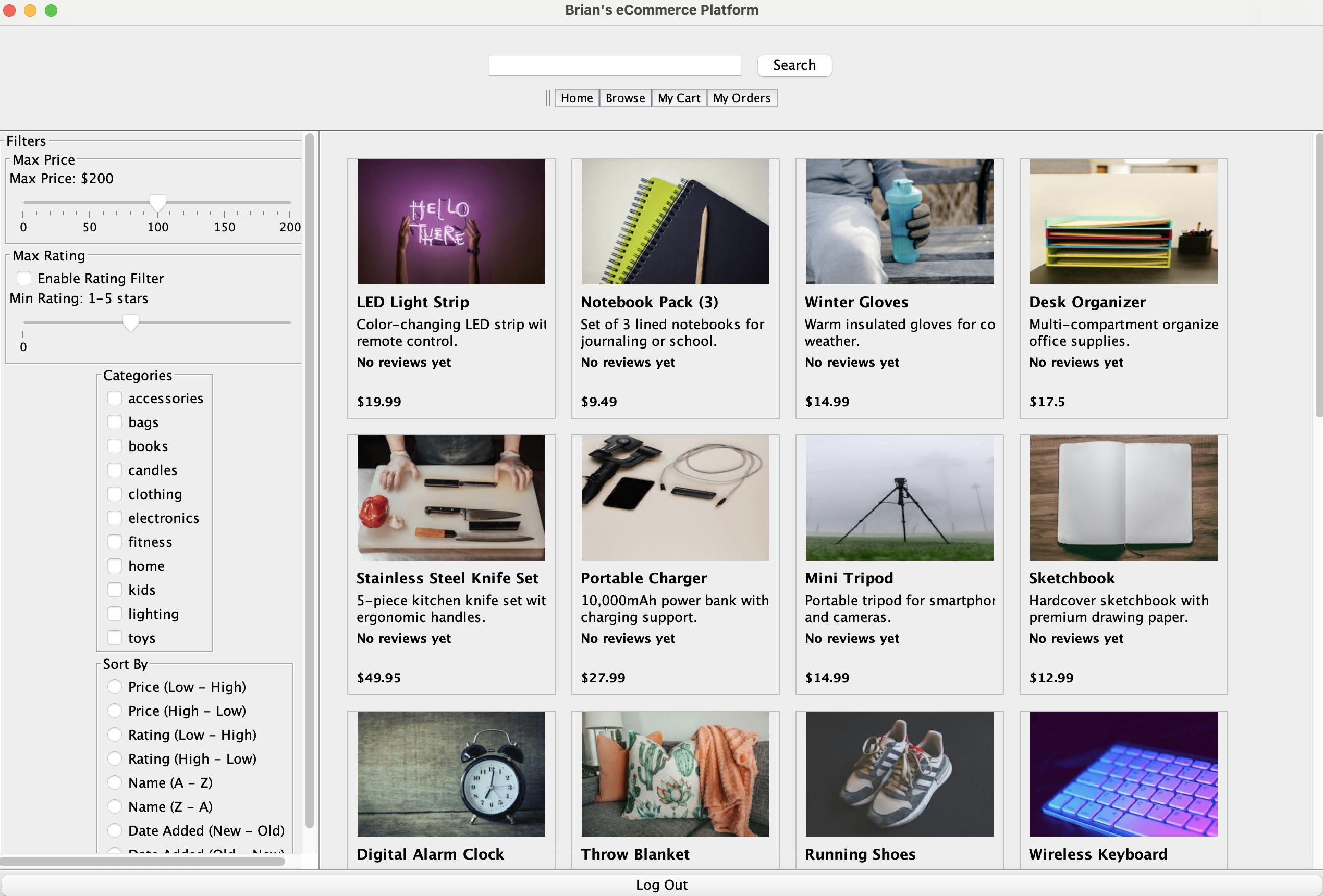 A desktop eCommerce simulator built in Java with a full shopping cart, inventory management, and order workflow.